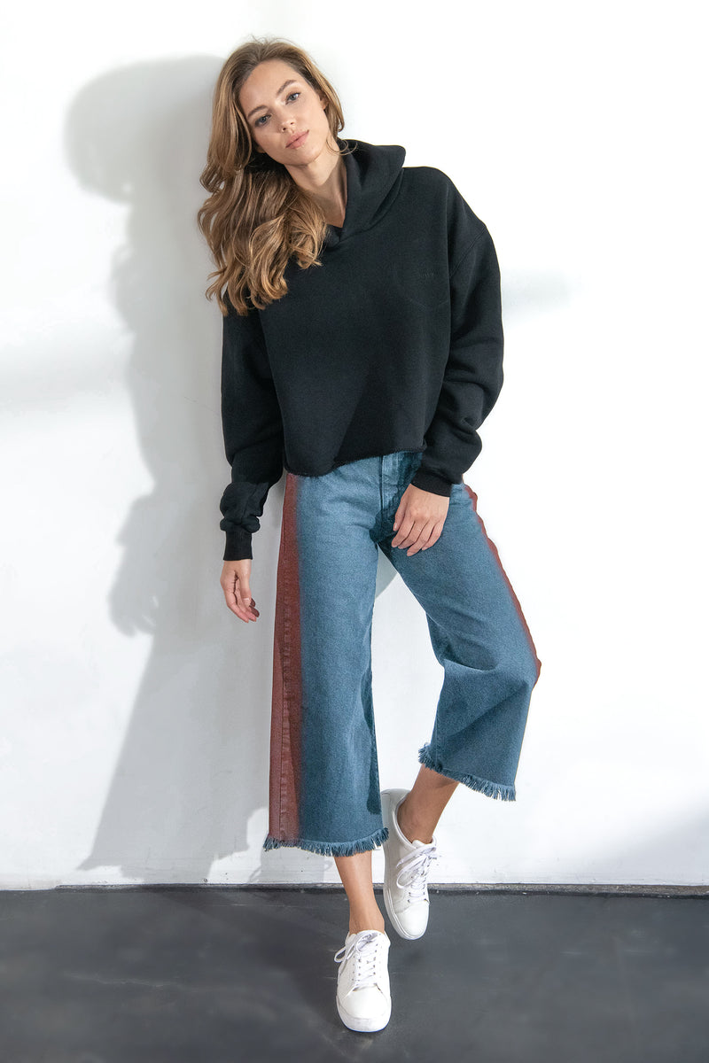 The Milena is a high rise relaxed wide leg pant with a cropped inseam. It features vintage 5 pocket construction with classically styled straight seams, traditional five point asymmetric back pockets and zipper-fly front enclosure.